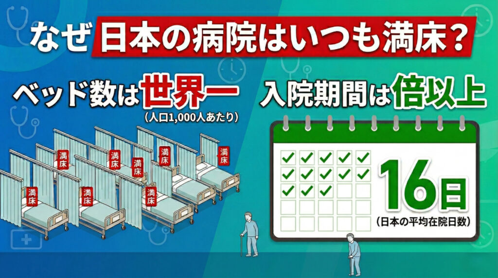 ベッドの数がいくら多くても、一人が長く使い続ければ当然空きません。「満床」の正体は、病床不足ではなく在院日数の長さなのです。