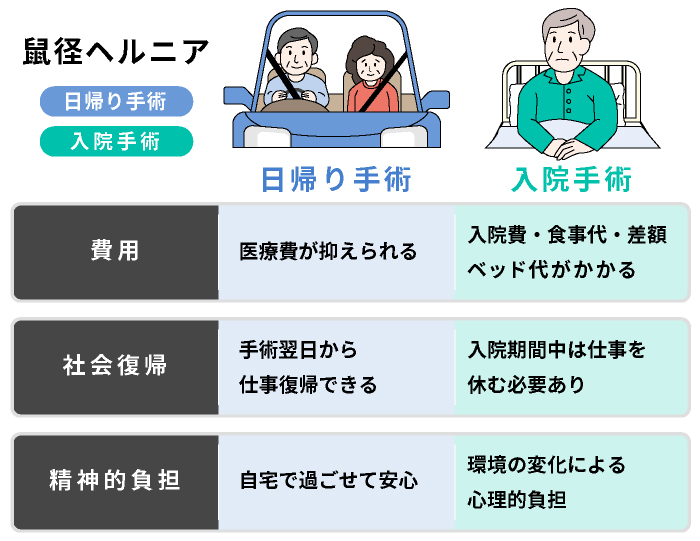 - 日帰り手術と入院手術:鼠径ヘルニア治療の新しい選択肢