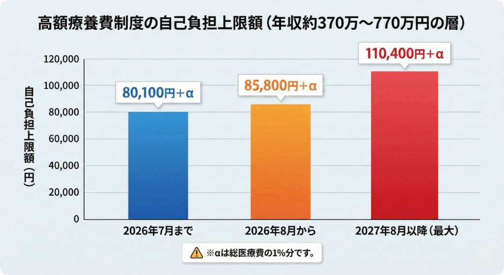 特に「年収約370万~770万円」の現役・シニア層の方は、1ヶ月の負担上限が以下のように変わります。